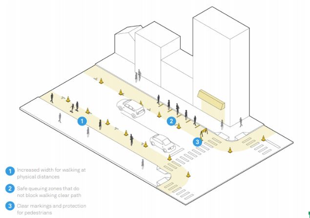 One simple way that many cities are making their downtowns more viable is through sidewalk extension. Extending sidewalk width allows for pedestrians to pass each other at a comfortable distance and it allows space to be used for additional outdoor seating. This outdoor seating is especially valuable to restaurants who need the additional space in order to keep customers at a safer distance. Sidewalks can be extended in a number of different ways. Street-side parking can be blocked off to instantly double the width of sidewalks for walking, sitting, or waiting. This concept is called “Open Curbs”. Another popular strategy is using “Parklets” which are pedestrian structures that take the place of a single parking space